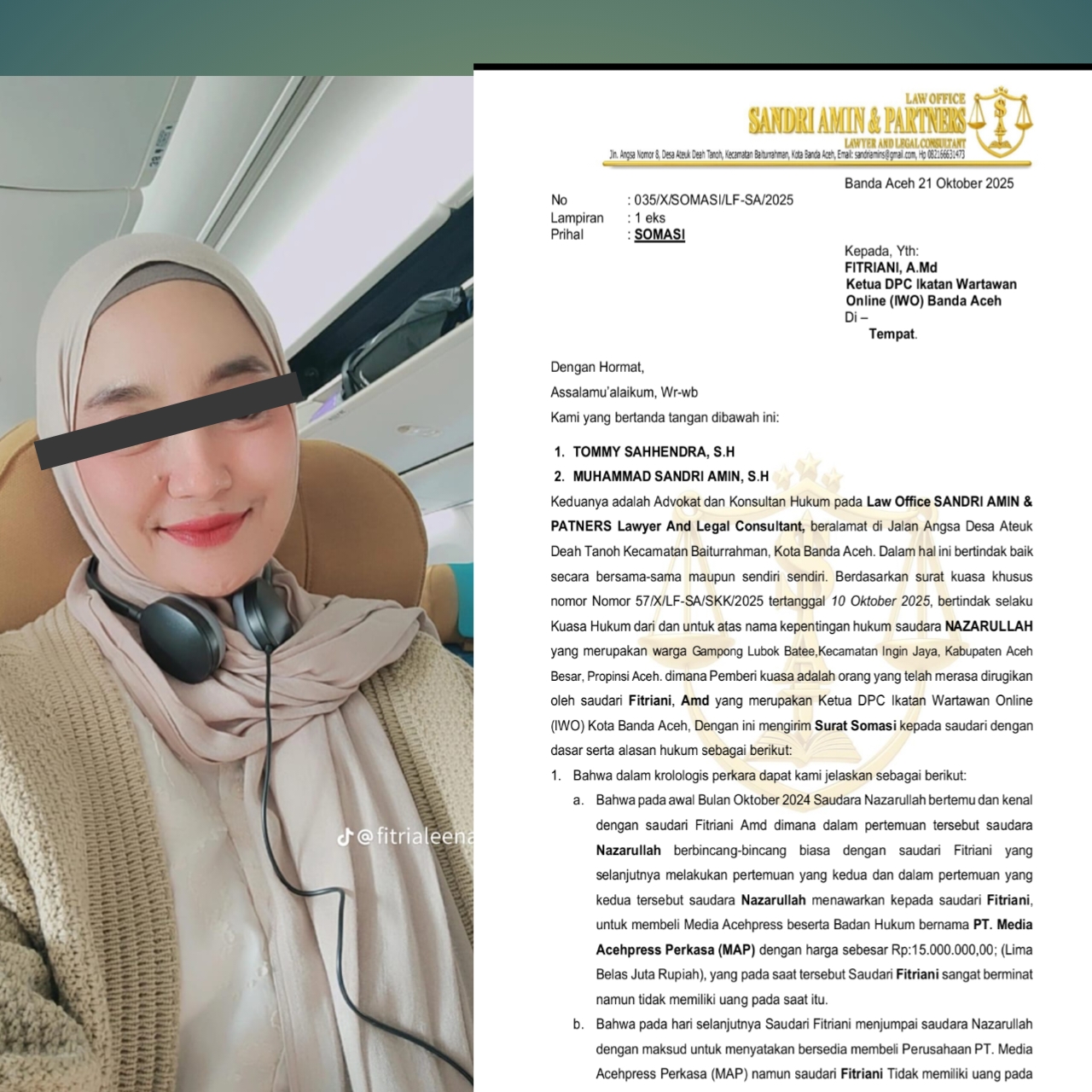 Dunia jurnalistik Aceh diguncang dengan kabar mengejutkan sosok Ketua PD Ikatan Wartawan Online (IWO) Kota Banda Aceh, Fitriani, kini ianya disomasi oleh dua pengacara akibat dugaan kasus pidana penipuan dan penggelapan.